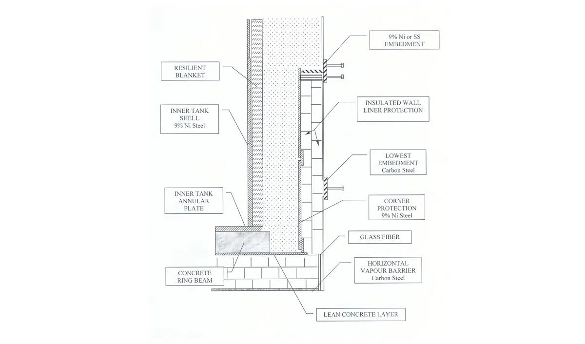 TCP的構造為外槽垂直向上延伸5m高圓筒與夾層底部的9%鎳鋼,和垂直圓筒在外牆之間設置由剛性泡沫玻璃製成的保冷層組成。TCP的作用是留存BOG冷凝之液體及內槽溢流或洩漏至夾層之LNG,其設置可抵抗超低溫液體,使結構不致受損。因懸頂儲槽內槽與外槽空間相通,需設置TCP,設計參照API 625 6.8章節或EN14620 Part1 7.1.11章節。