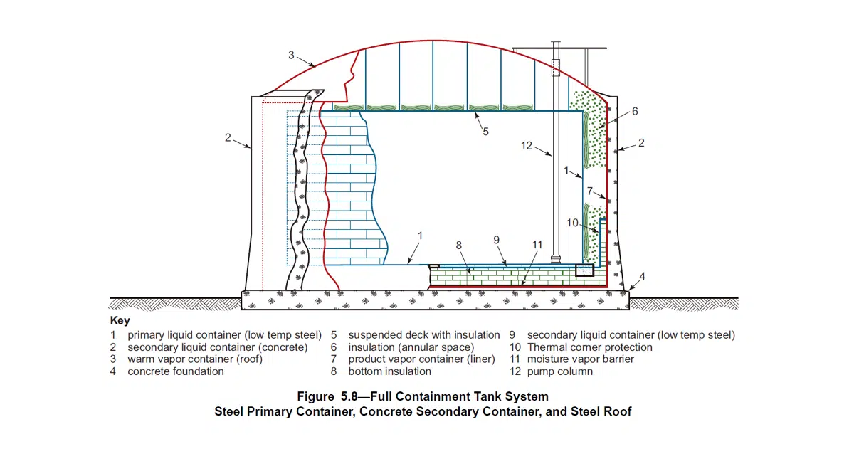 參照API625第5.4章節說明,液體密封(Liquid tight)之內槽(Primary container)及液體(Liquid tight)與氣體密封(Vapor tight)之外槽(Secondary container),兩者具有獨立儲存作用。外槽需能抵抗內槽洩漏液體至外槽的液體與產生氣體,使其結構不致受損壞。