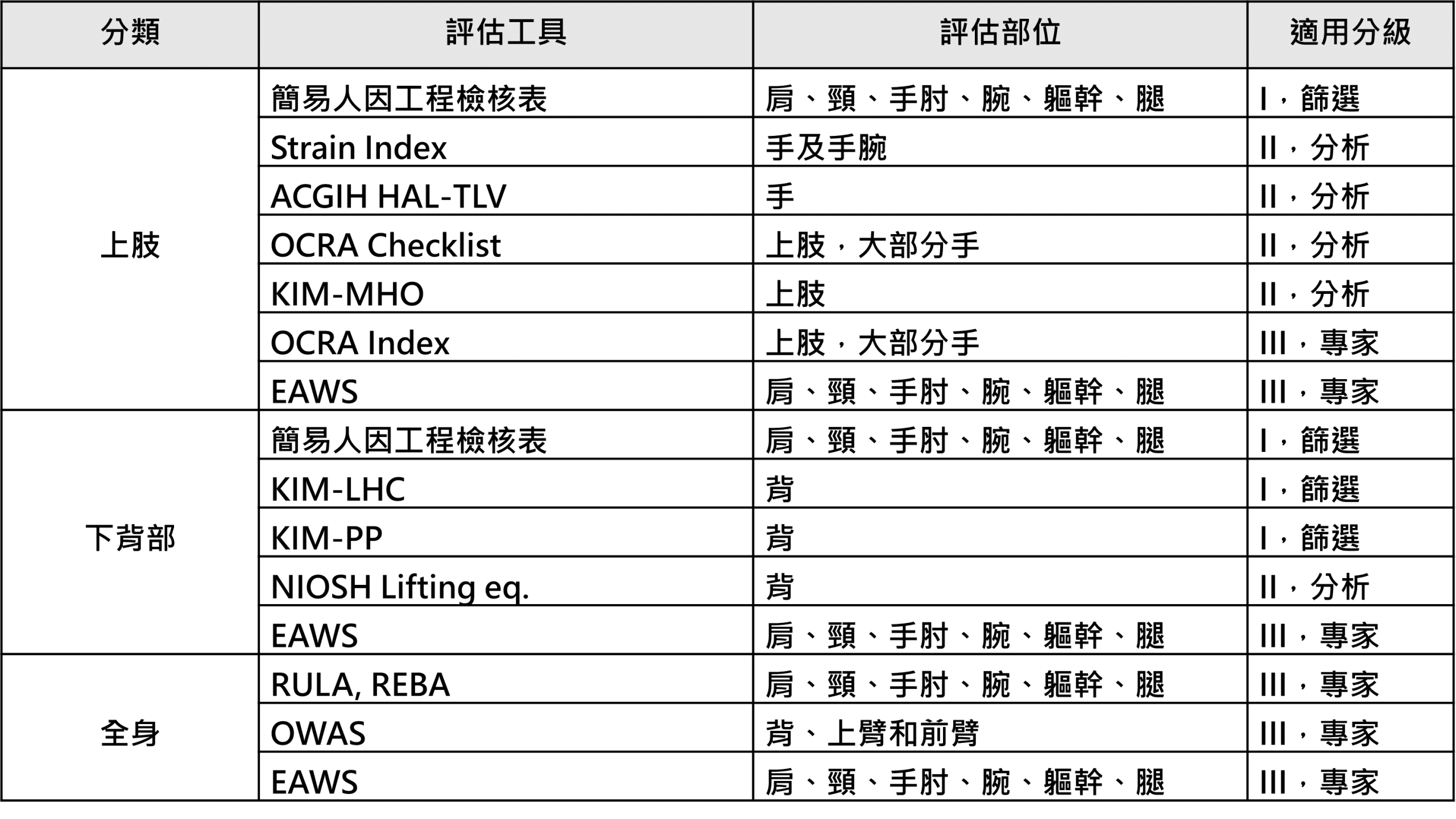 必須要注意的是,各種不同的評估方法,因為其設計的背景理論與考量因素略有不同,因此對於不同作業種類、不同肌肉骨骼傷病部位的適用性也有相當的差異,表2為常見肌肉骨骼傷病分析工具,可作為初步評估工具之選用參考。另針對不同的作業與不同傷病部位,如需進一步進行危害分析疾風險評估,可參考勞安所歷年研究報告、技術叢書或國際期刊內容,選擇敏感性與準確性較佳的方法,以使評估結果能具有較佳的參考性,作為人因工程危害預防計畫改善策略規畫之依據。