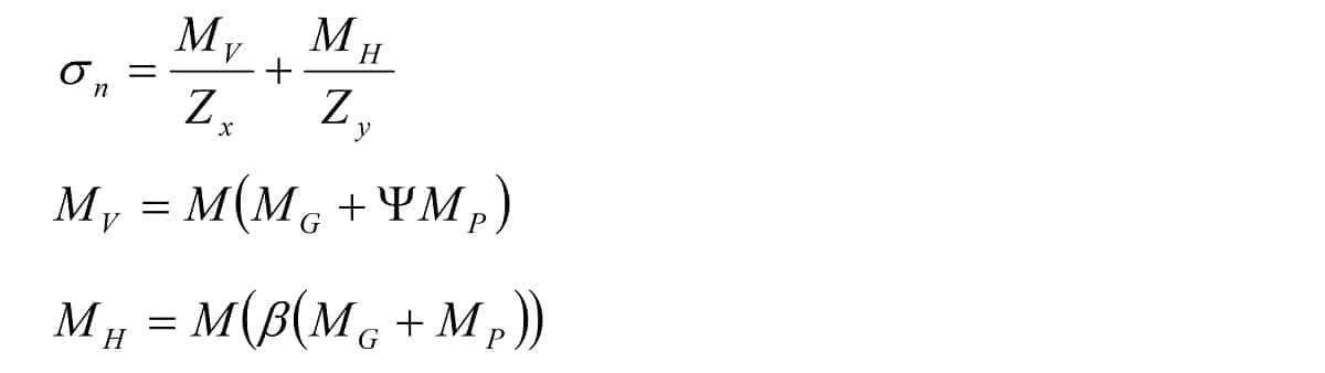 考慮伸臂受吊運車輪所傳遞的集中負載P,並考慮結構自重、因吊運車移動所產生之慣性力,伸臂之正向應力(Normal Stress)表示為